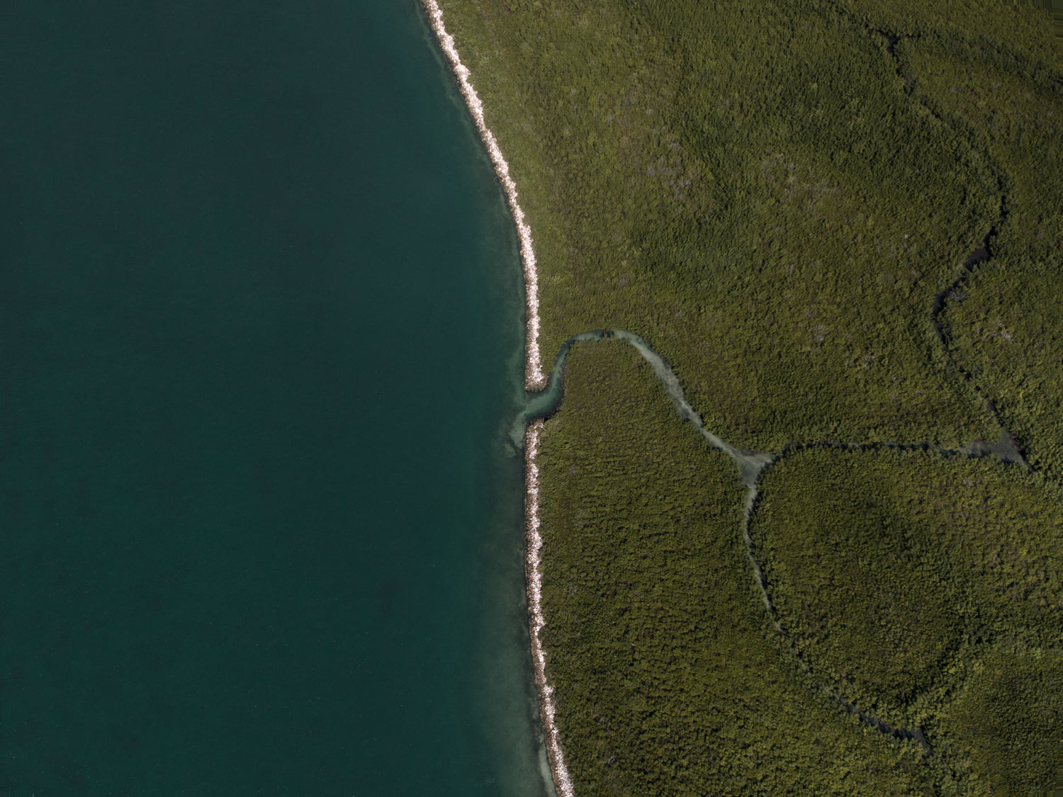 A topdown drone photo of encounter of green of the trees vegetation and the blue of the river.