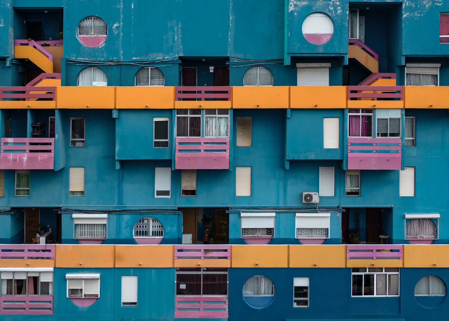 A front drone shot of Blue Architecture Facade Block in Marvila, Chelas , Lisbon.