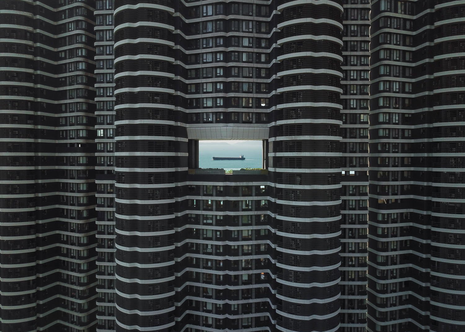A drone shot of a building in Hong Kong on the perfect time a Cargo Boat is crossing in Kennedy Town, Hong Kong.