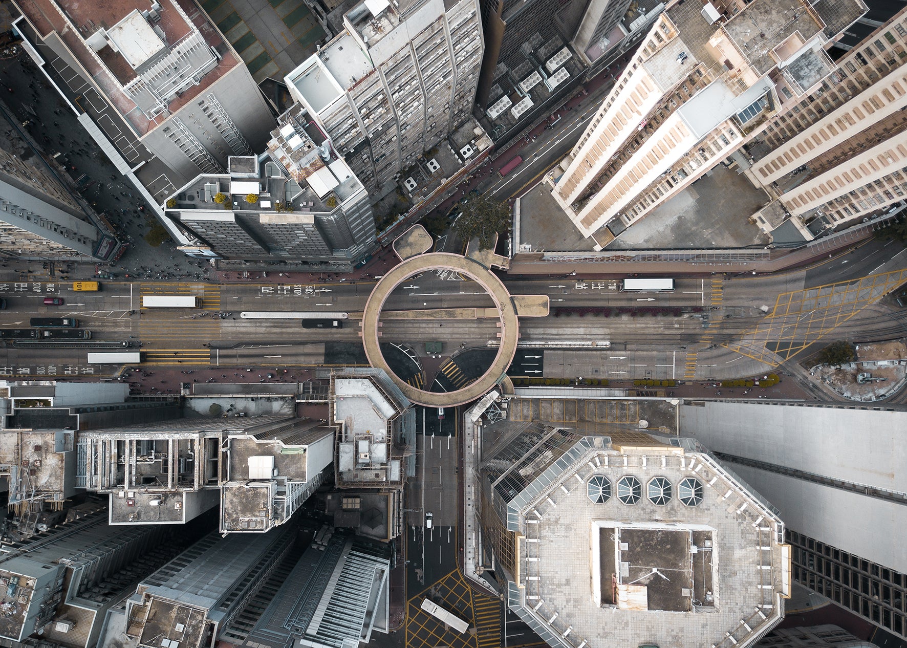 A topdown drone photo of neighborhood in Kowloon, Hong Kong with 3 buildings with special architectural shapes.
