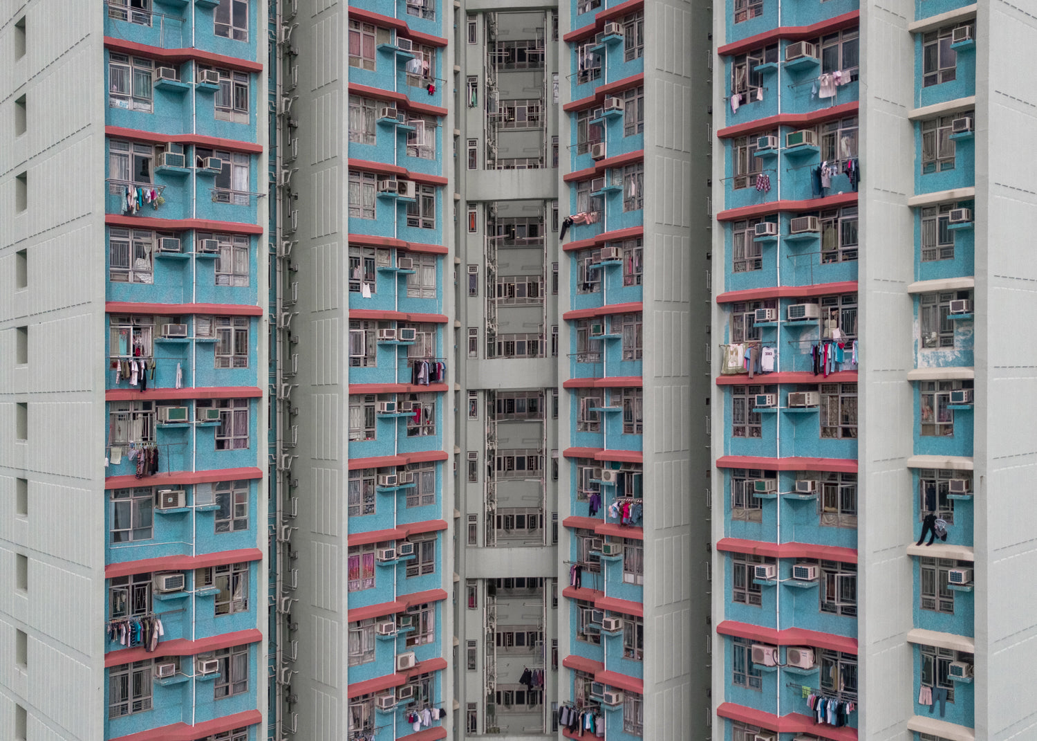 A drone shot of colorful facade of Kowloon, Hong Kong