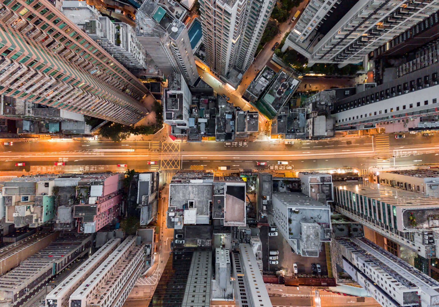 A topdown drone shot during night time in between skyscapers Sheung Wan, Hong Kong.