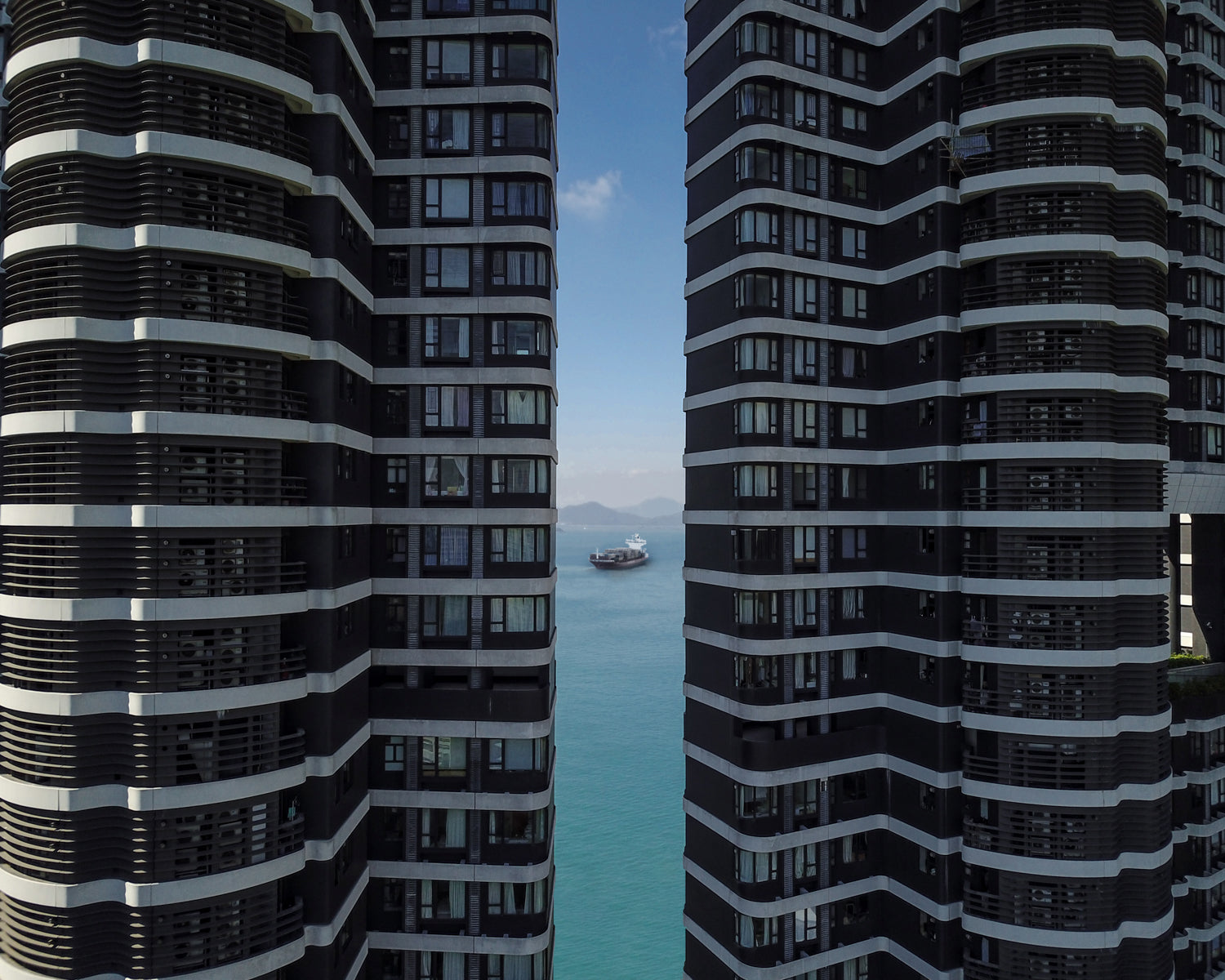 A drone shot of a boat in between two buildings in Kennedy Town, Hong Kong.