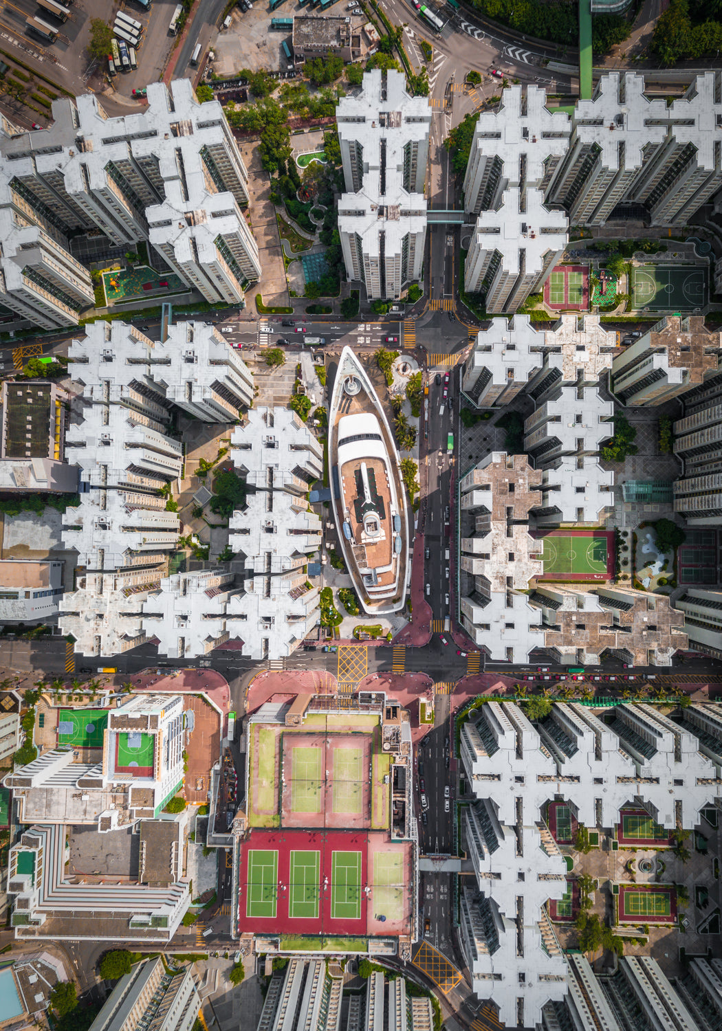A topdown drone shot of Whampoa Garden, the Cruise located in Hung Hom, Kowloon, Hong Kong.