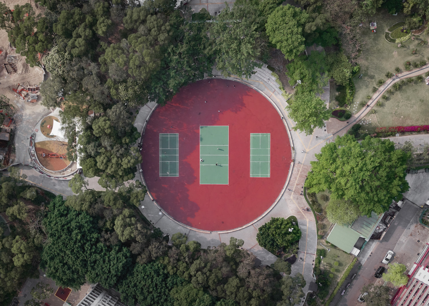 A topdown drone shot of bright colorful basketball court remebering the Japanese Flag located in Kowloon , Hong Kong.