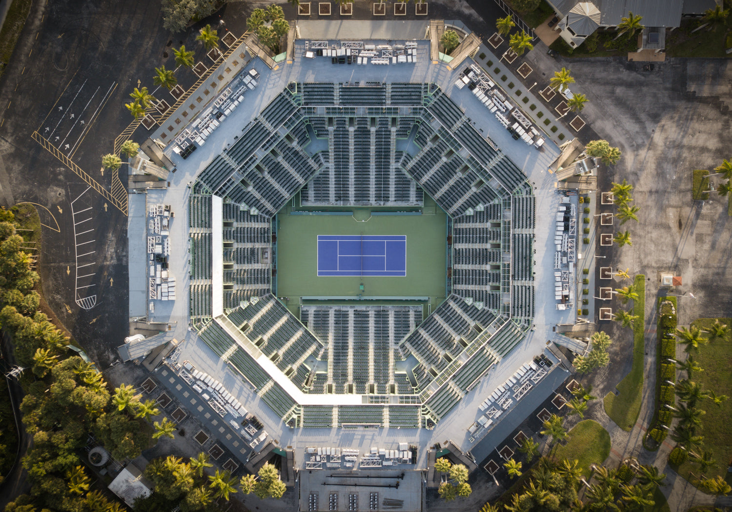 A topdown drone shot of Tennis Stadium located in Key Biscane, Miami, Florida.