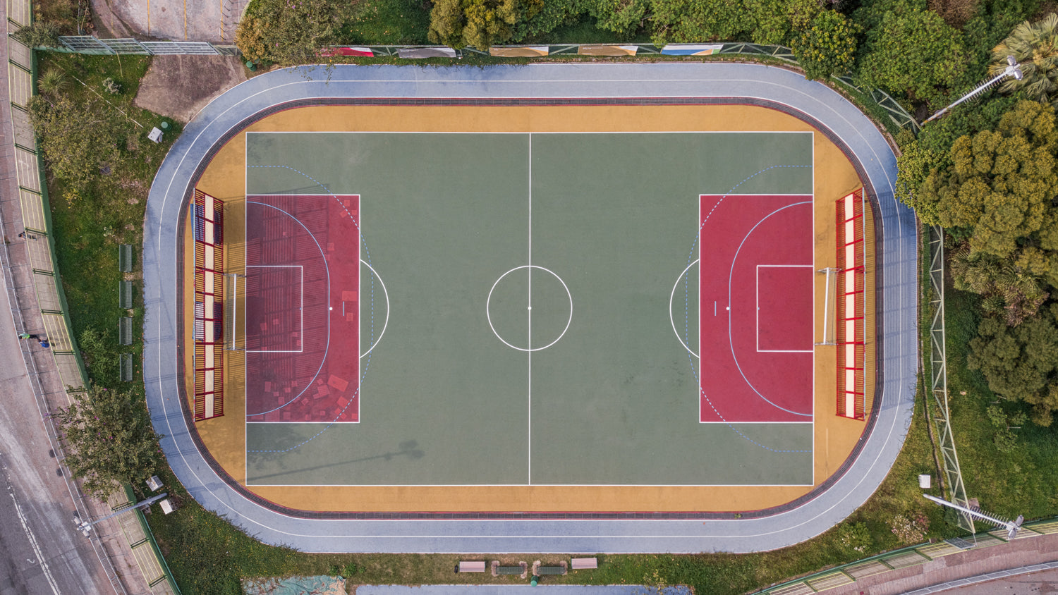 A topdown drone shot of bright colorful soccer stadium located in Choi Hung State Building, reinforced by the beautiful colors of red, orange, yellow and blue.