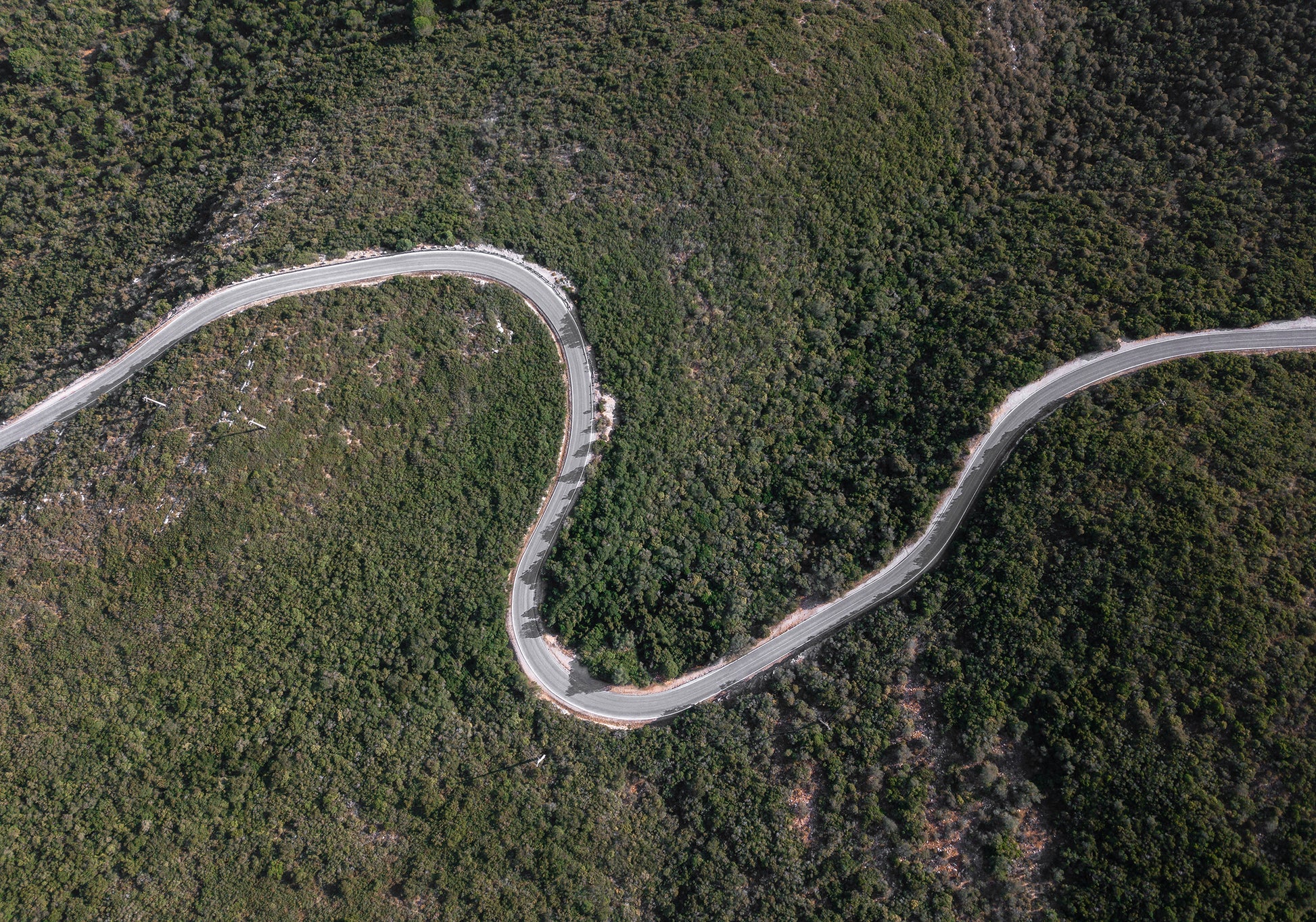 A topdown drone shot of the pattern and road lines remembering the colours of Mars on the orange mountains, located in FuerteVentura, Canary Islands in Spain.
