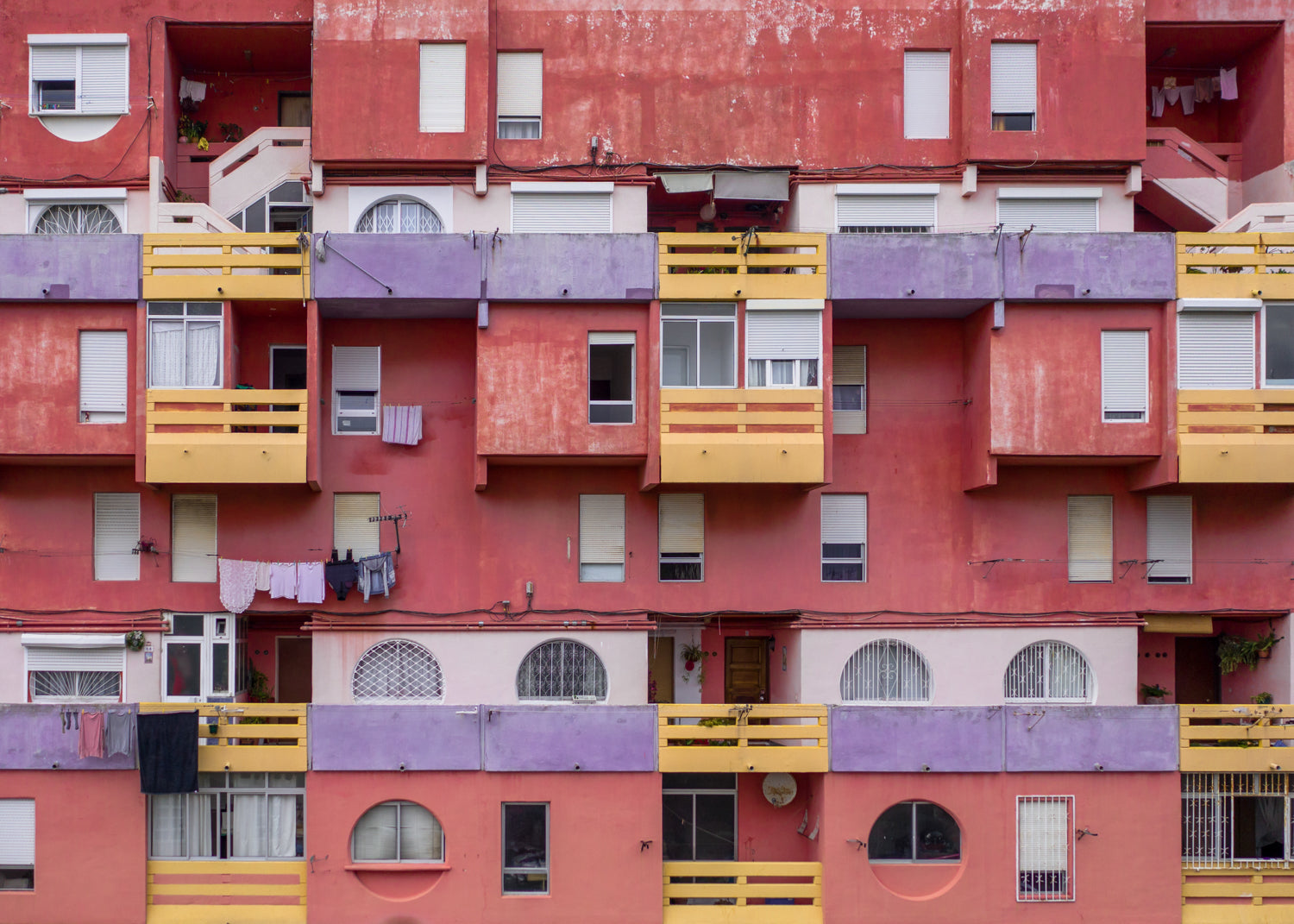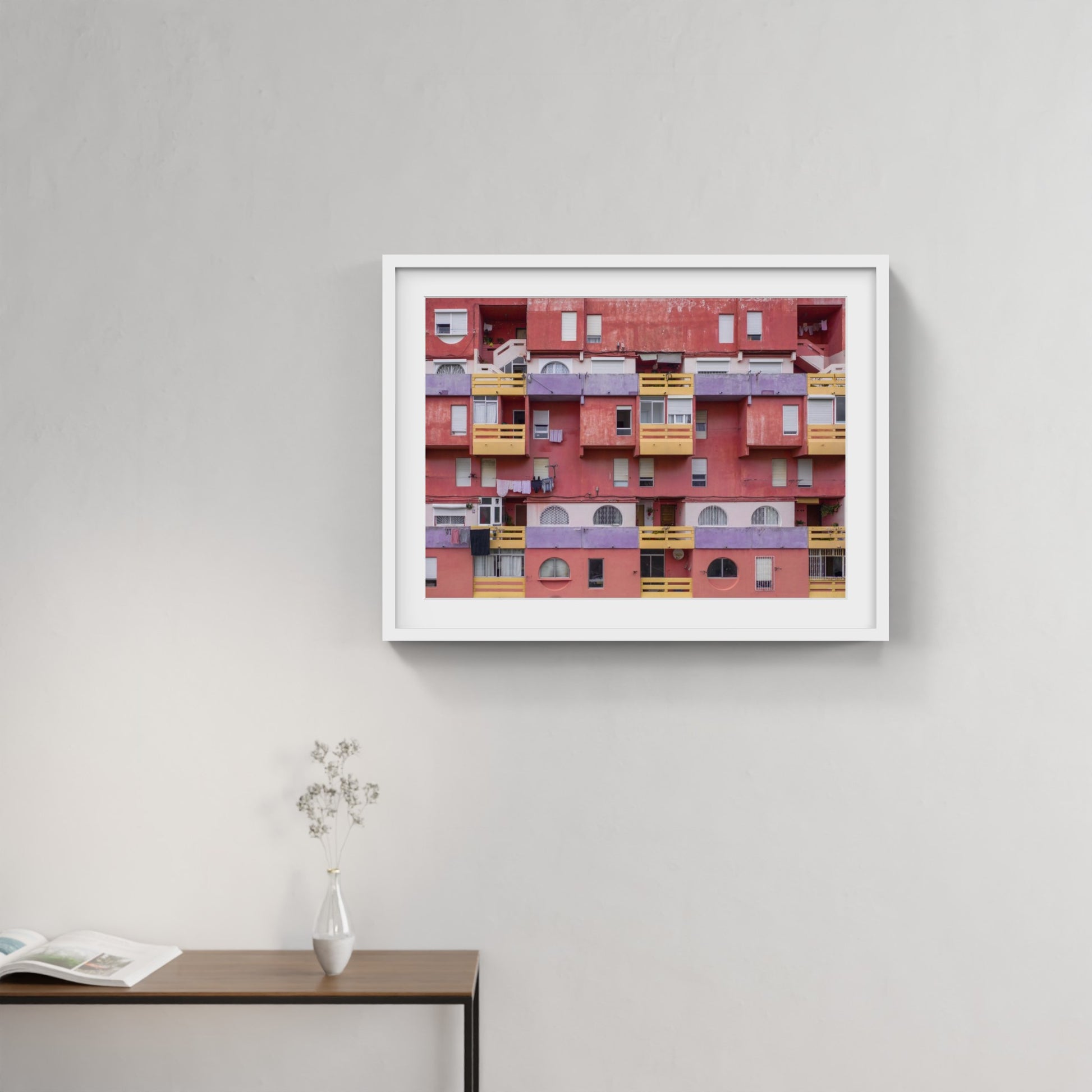 A front drone shot of Red Architecture Facade Block in Marvila, Chelas , Lisbon.