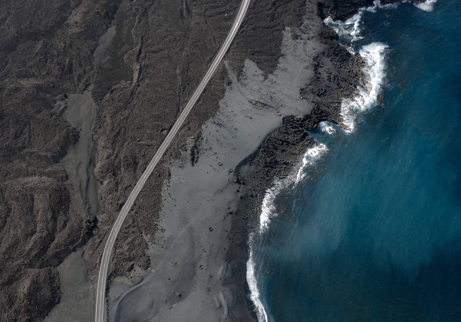 A topdown drone shot of Black Sand Beach, a curved road and the deep blue ocean in Lanzarote, Canary Island, Spain.
