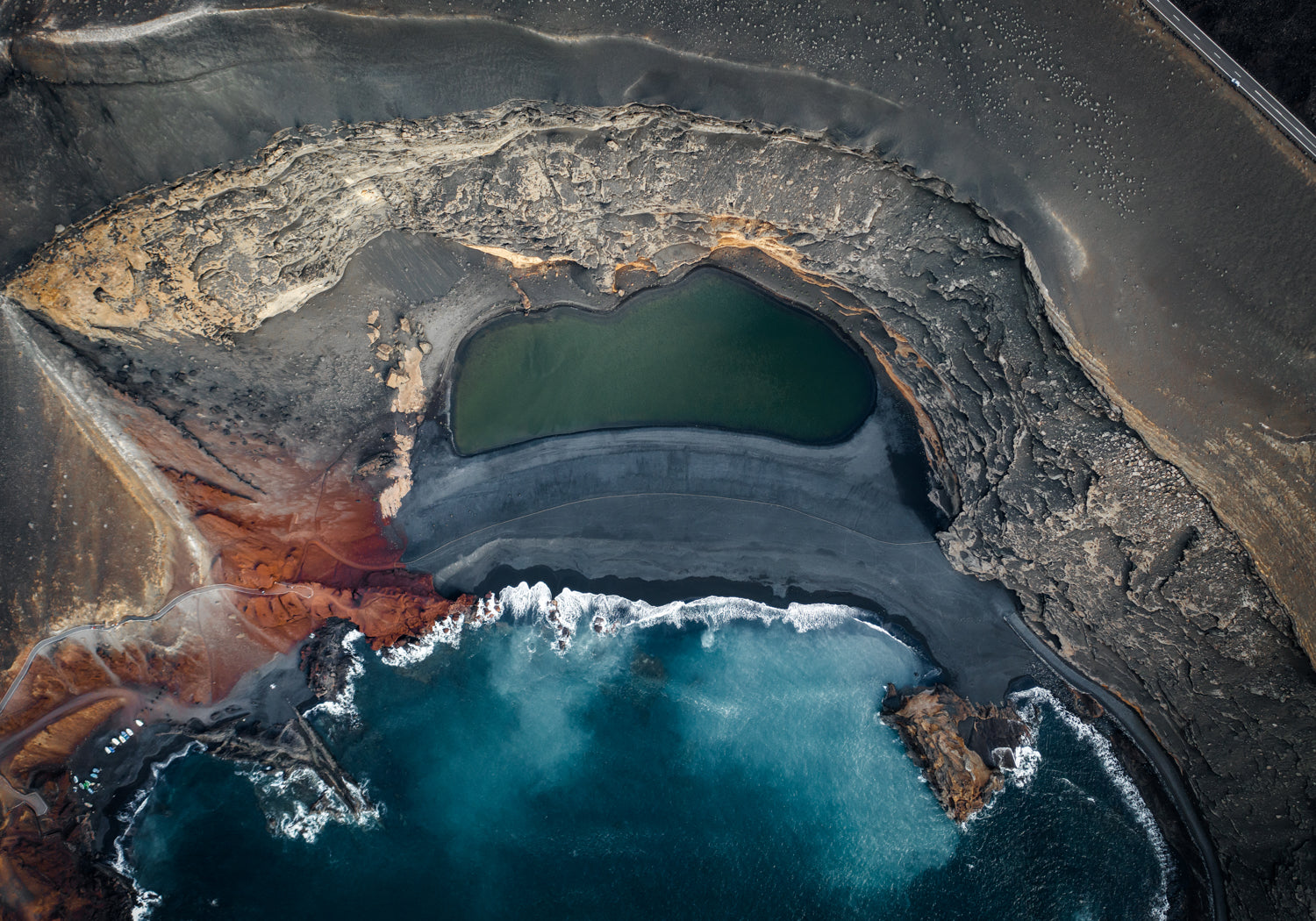 A topdown drone shot of a combination of various colours and shapes in Nature. Green Lake, Blue Ocean, Red Rocks, Black Sand and Yellow Mountains in Lanzarote, Spain.