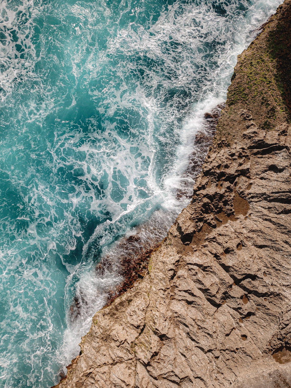 A topdown drone shot of multi textures of the rocks and water in Indonesia