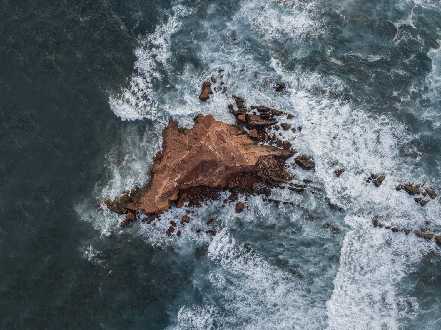 A topdown drone photo of movements of the atlantic ocean on the rocks, somewhere in Portugal