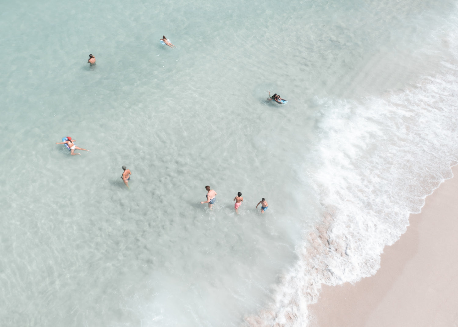A topdown drone photo of kids playing in the clear water during the European Summer.