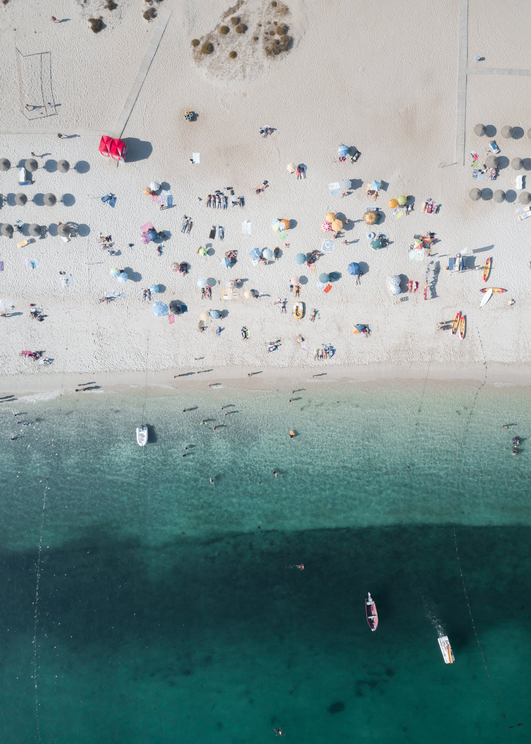 A topdown drone photo of Portinho da Arrabida blue, green and yellow sunshades umbrellas connected with the sand and the water of the atlantic ocean, remembering the tropical summer days.