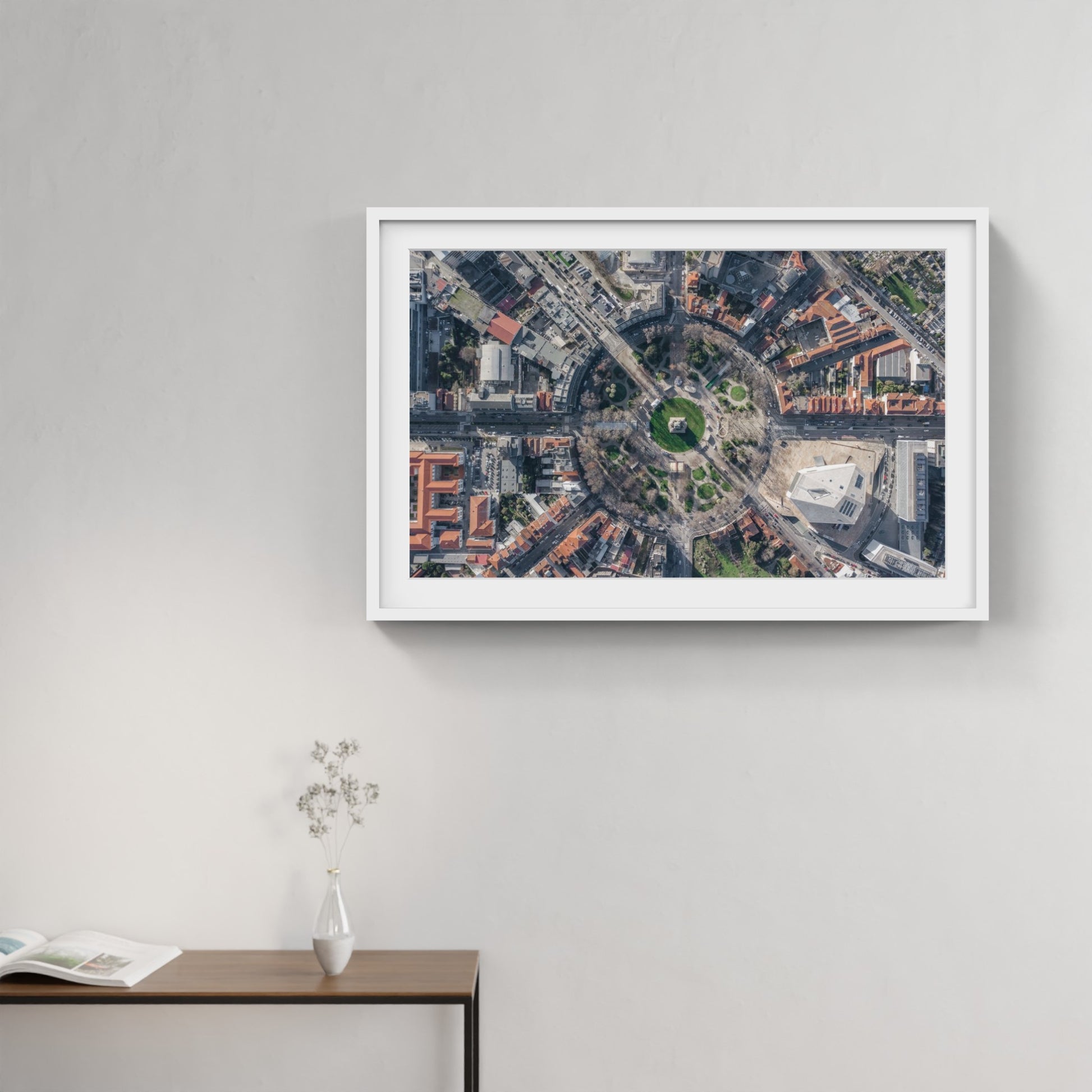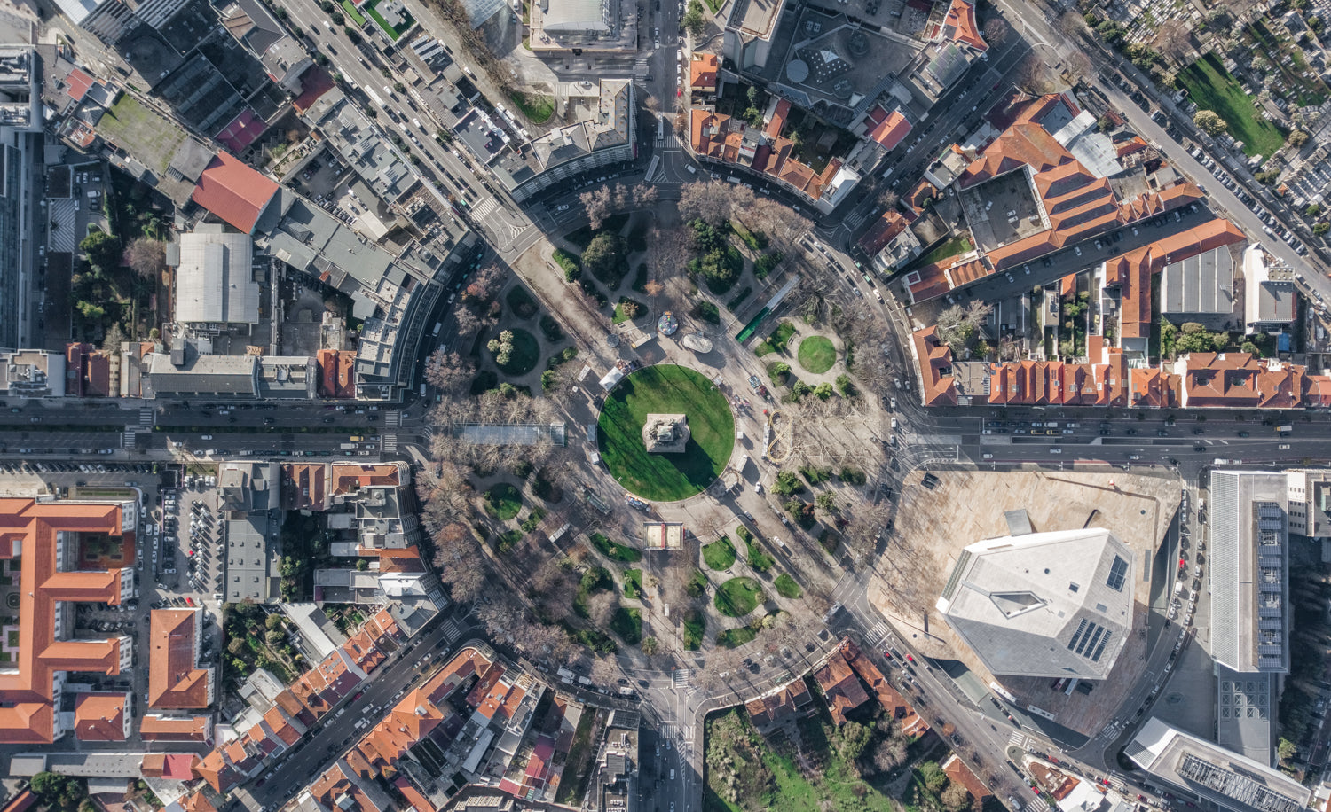 A topdown drone photo of "Rotunda da Boavista" located in Porto, Portugal