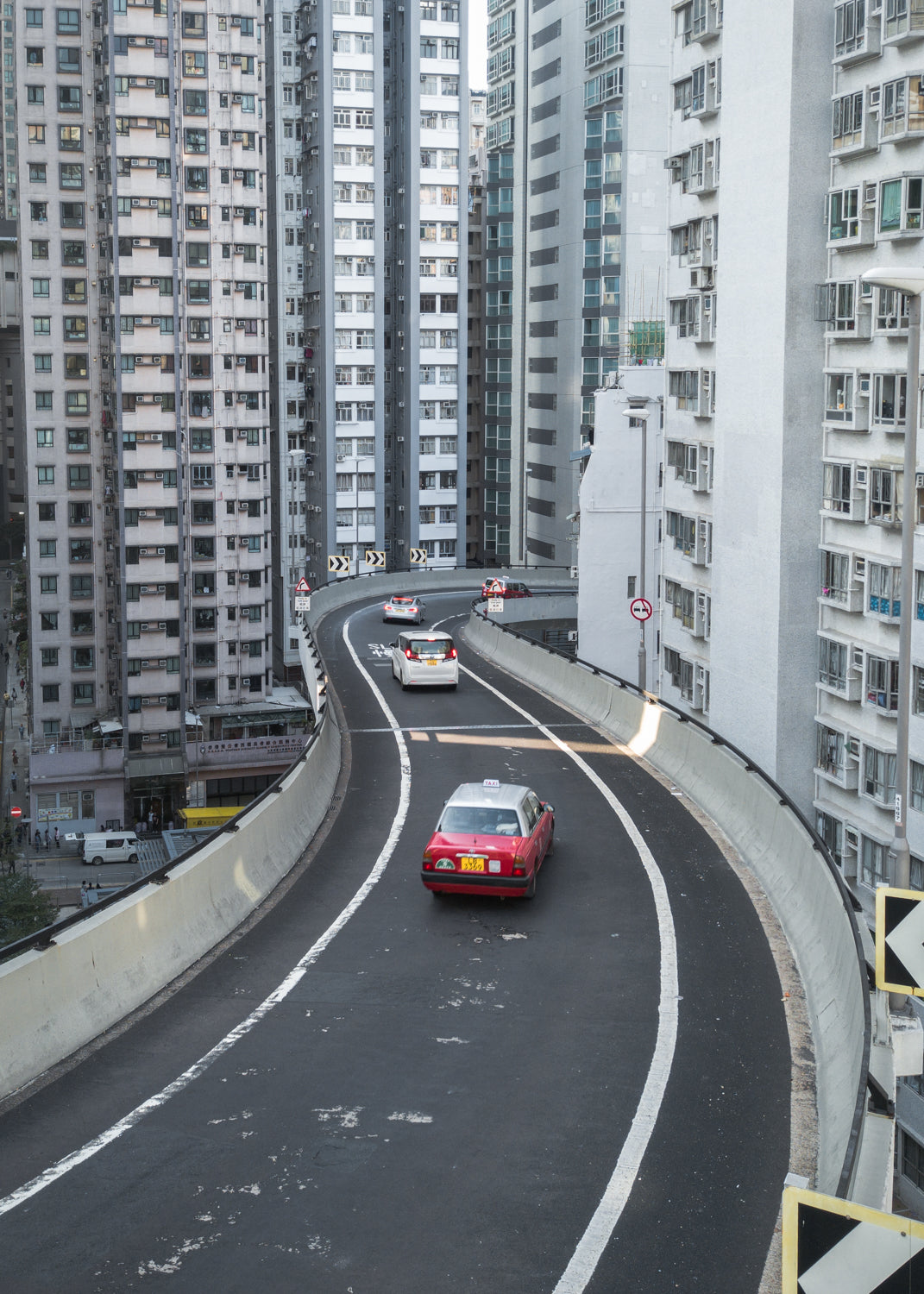 A side drone photo of the Red Hong Kong Taxi in a curved road located in Sheung Wan, Hong Kong