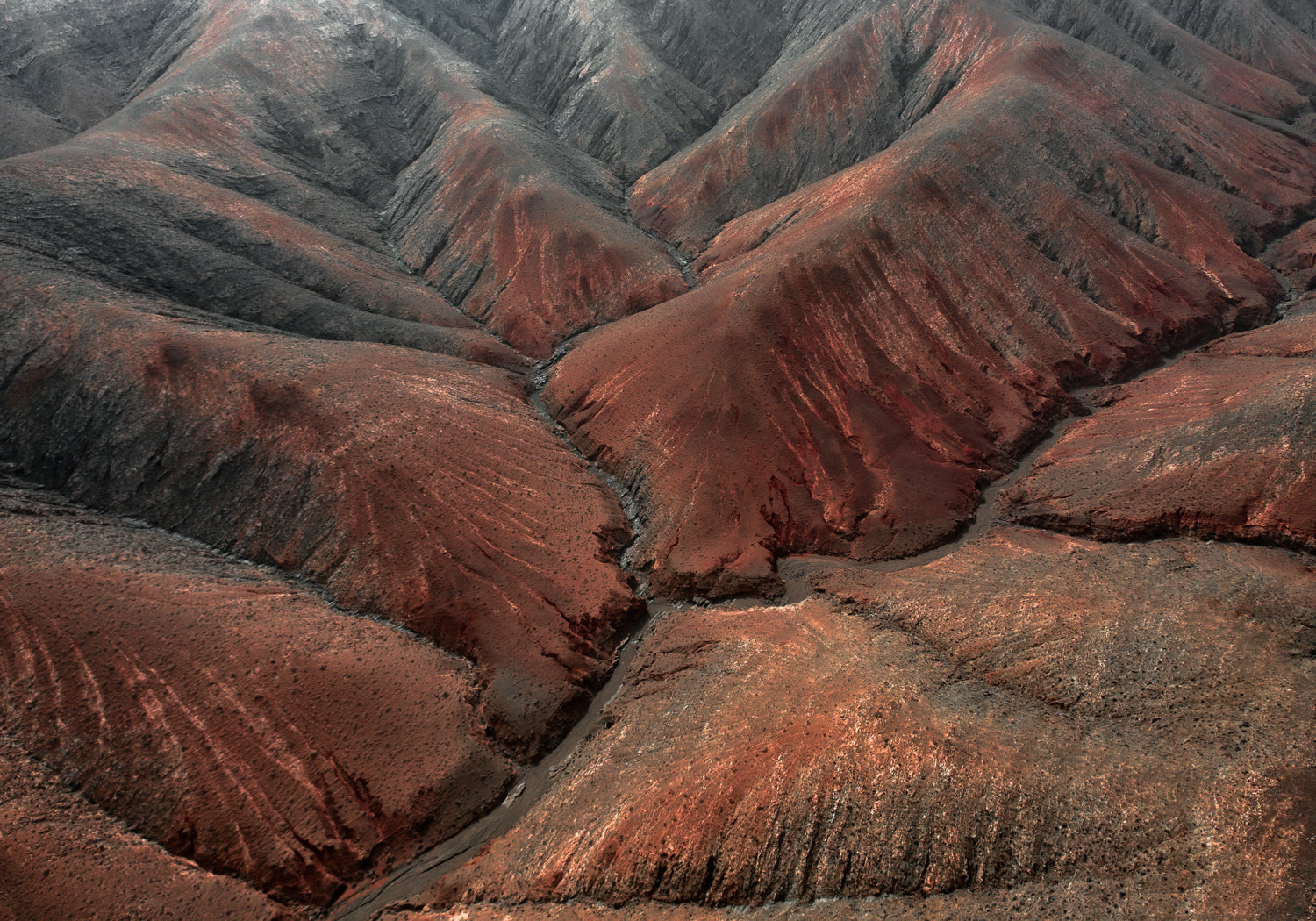 A topdown drone shot of the pattern and road lines remembering the colours of Mars on the orange mountains, located in FuerteVentura, Canary Islands in Spain.