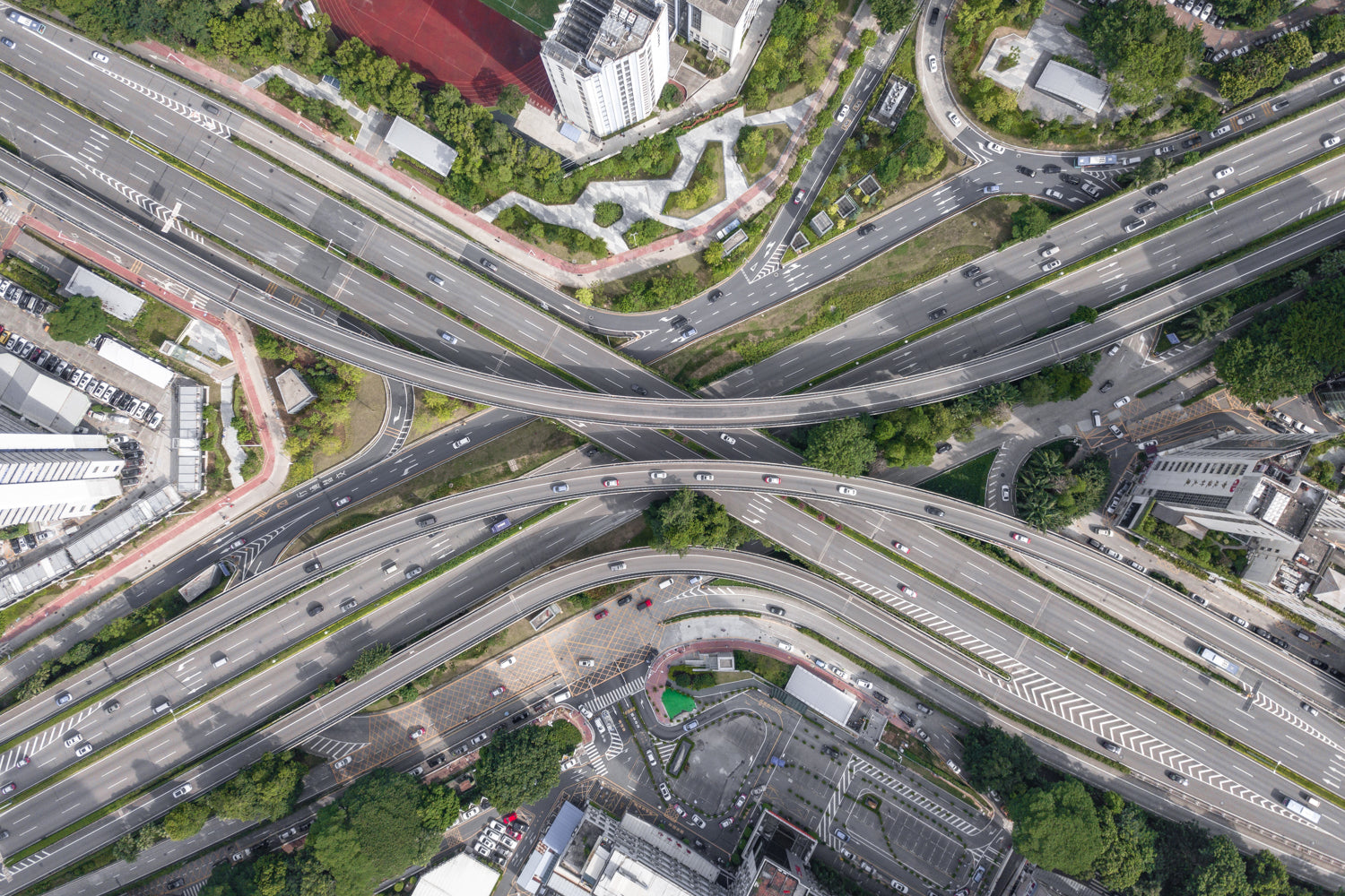 A topdown drone photo of busy , densed crossroads in Shenzhen, China