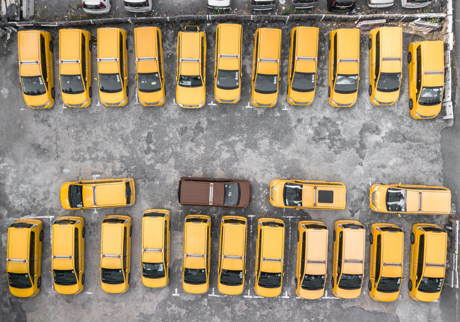 A topdown drone photo of a snuggle between Brown Taxi and the Yellow Taxis