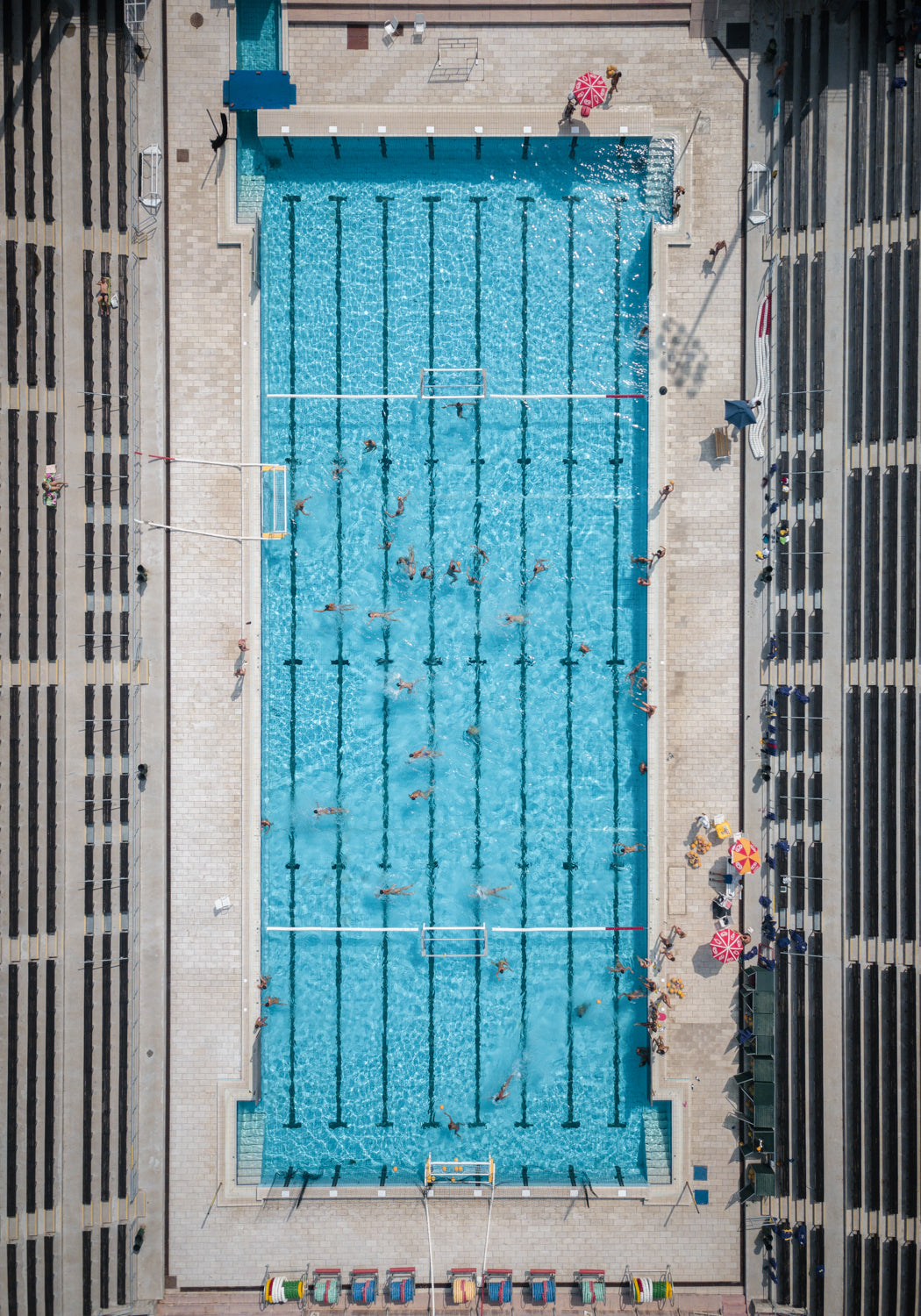 A topdown drone photo of swimming pool , with people swimming and playing remembering summer days.