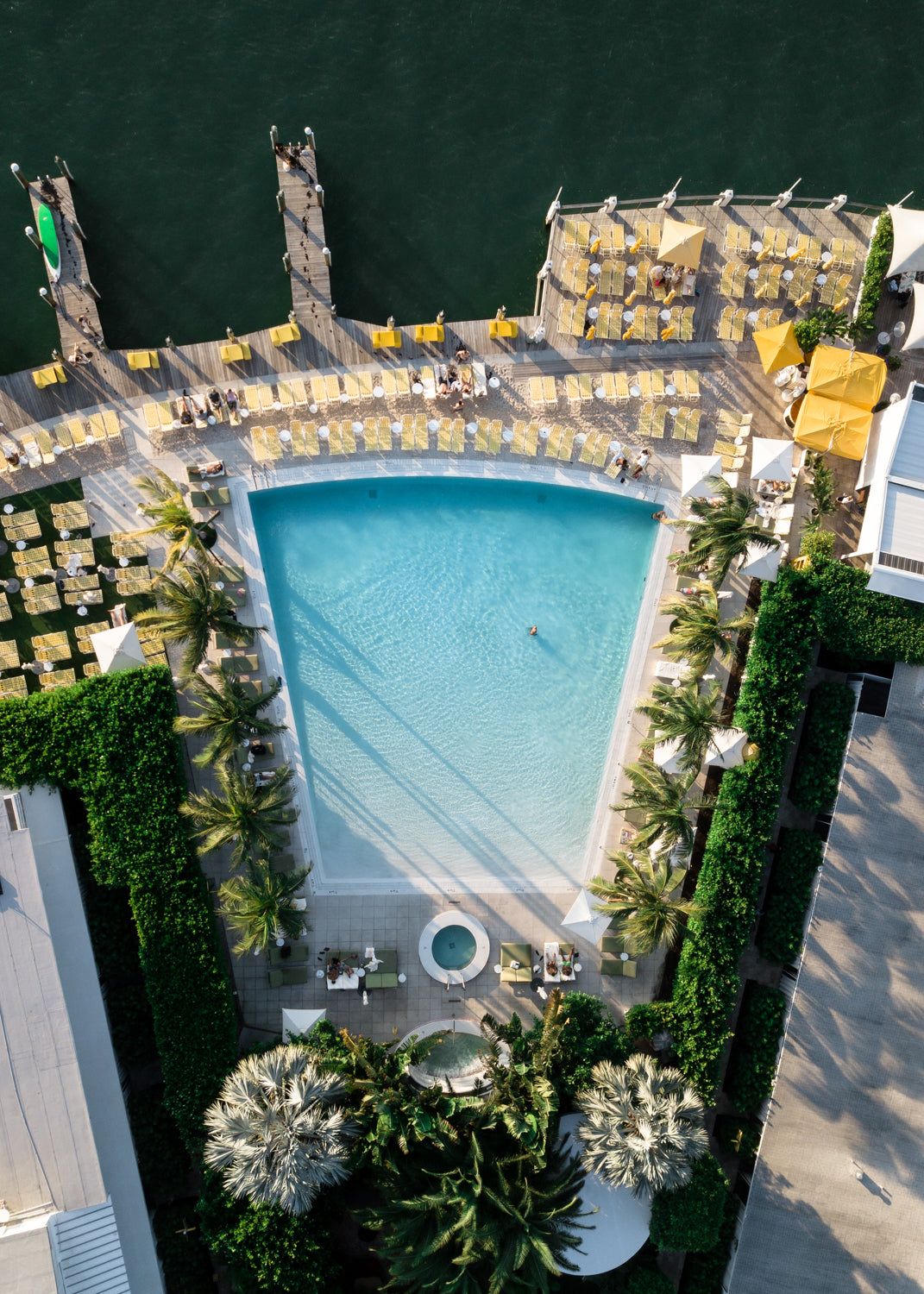 A topdown drone photo of The Standard , The Lido, and its swimming pool in Miami Venetian Islands.
