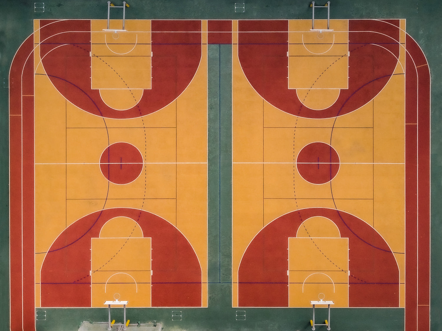 A topdown drone photo of yellow and red basketball court located in Hong Kong.