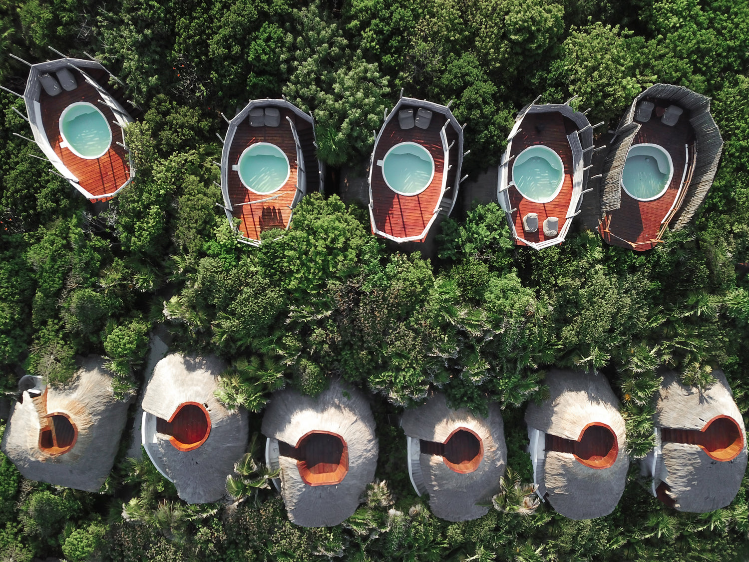 A topdown drone photo of the jungle Papaya Playa Project located in Tulum, Mexico.