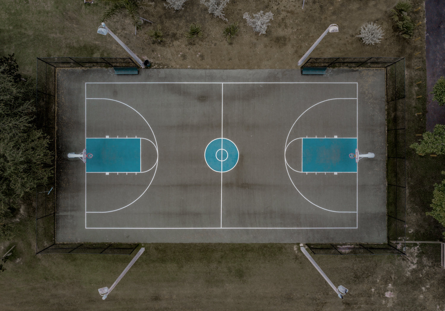A topdown drone photo of basketball court located in Turks and Caicos.