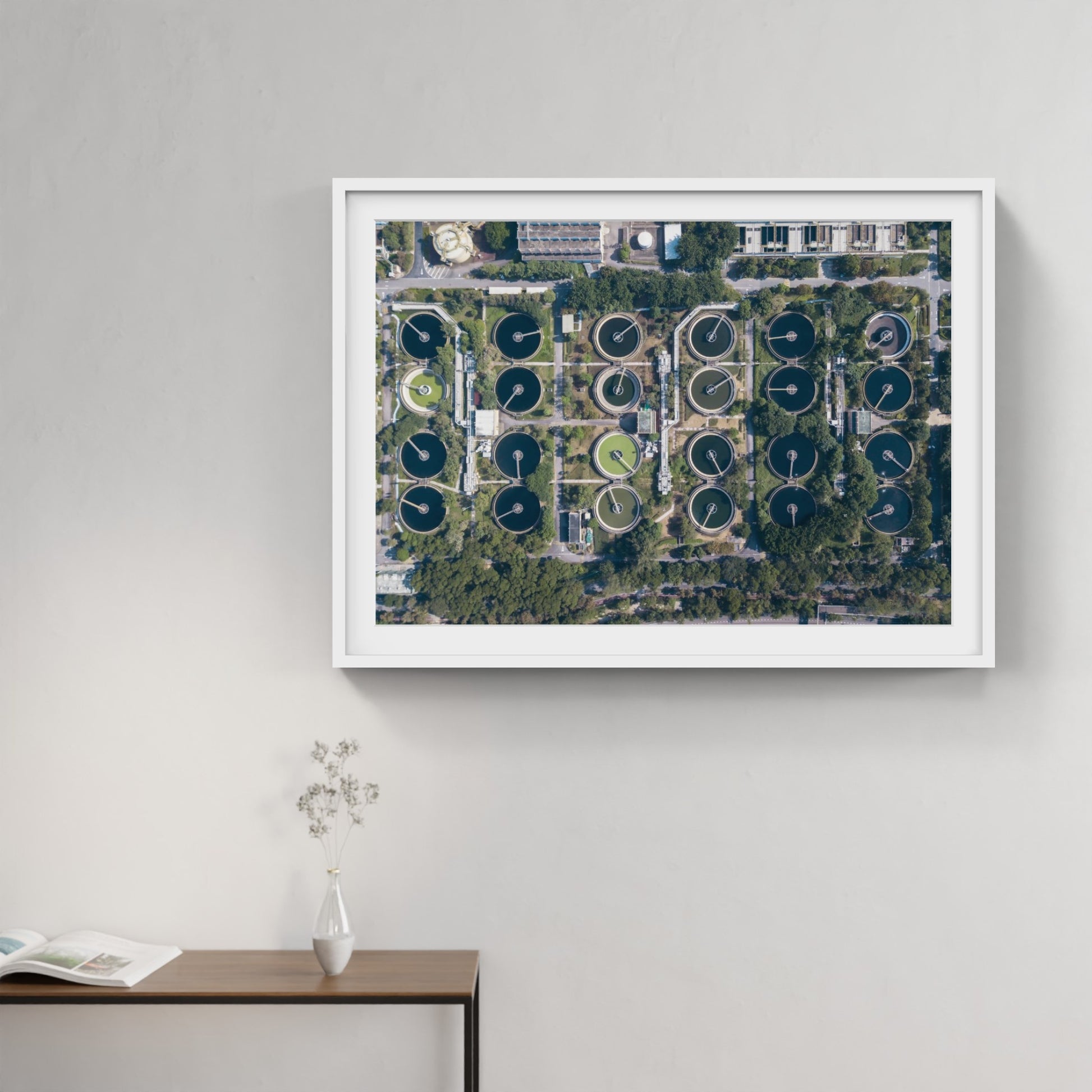 A topdown drone photo of water tanks treatment center looking like turntables, in Kowloon, Hong Kong